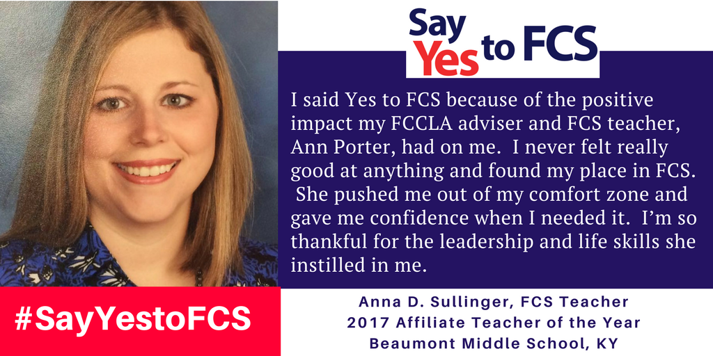 I said Yes to FCS because of the positive impact my FCCLA adviser and FCS teacher, Ann Porter had on me. I never felt really good at anything and found my place in FCS. She pushed me out of my comfort zone and gave me confidence when I needed it. I’m so thankful for the leadership and life skills she instilled in me.