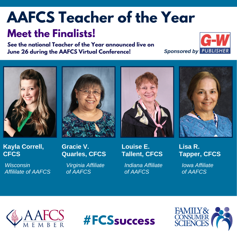 , the AAFCS National Teacher of the Year award was established in 1974 to recognize exemplary teachers who utilize cutting-edge methods, techniques and activities to provide stimulus and visibility to family and consumer sciences in elementary and secondary education. If you're "Zooming" to the AAFCS Virtual Conference, don't miss the