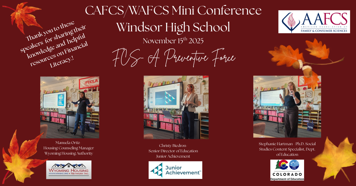 We had a great time on November 15th at the FCS Mini Conference for the Colorado and Wyoming affiliates held at Windsor High School. The day brought together teachers, extension agents and other FCS professionals from both affiliates to explore and learn about aspects of financial literacy.