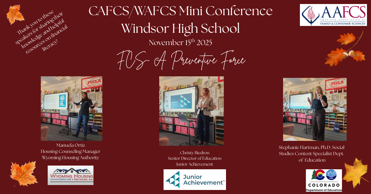 We had a great time on November 15th at the FCS Mini Conference for the Colorado and Wyoming affiliates held at Windsor High School. The day brought together teachers, extension agents and other FCS professionals from both affiliates to explore and learn about aspects of financial literacy.