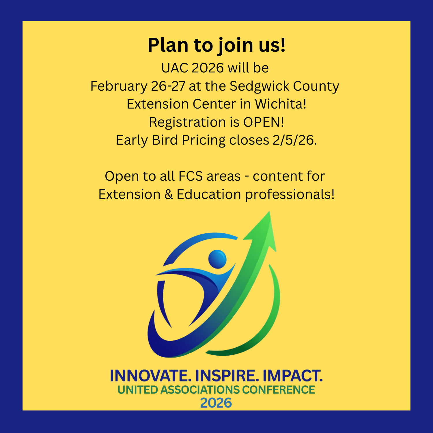 The United Associations Conference (UAC) brings together Family and Consumer Sciences professionals from education and extension for a time of learning, connecting, and neighboring. Family and Consumer Science students, professionals and advocates will gather in Wichita at the Sedgwick County Extension Education Center on February 25-27, 2026.