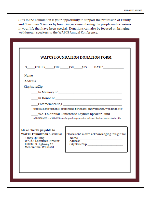 “Do your giving while you’re living, so you’ll be knowing where it’s going!” is a favorite line of Foundation Founder Karen Goebel. Experts advise to find your passion and concentrate your giving to what you are about and what you believe is important. Support those things that have meant the most to you. Make a decision to support the profession of Family and Consumer Sciences that affected your career choice, personal life, and introduced you to some of your life-long friends.
